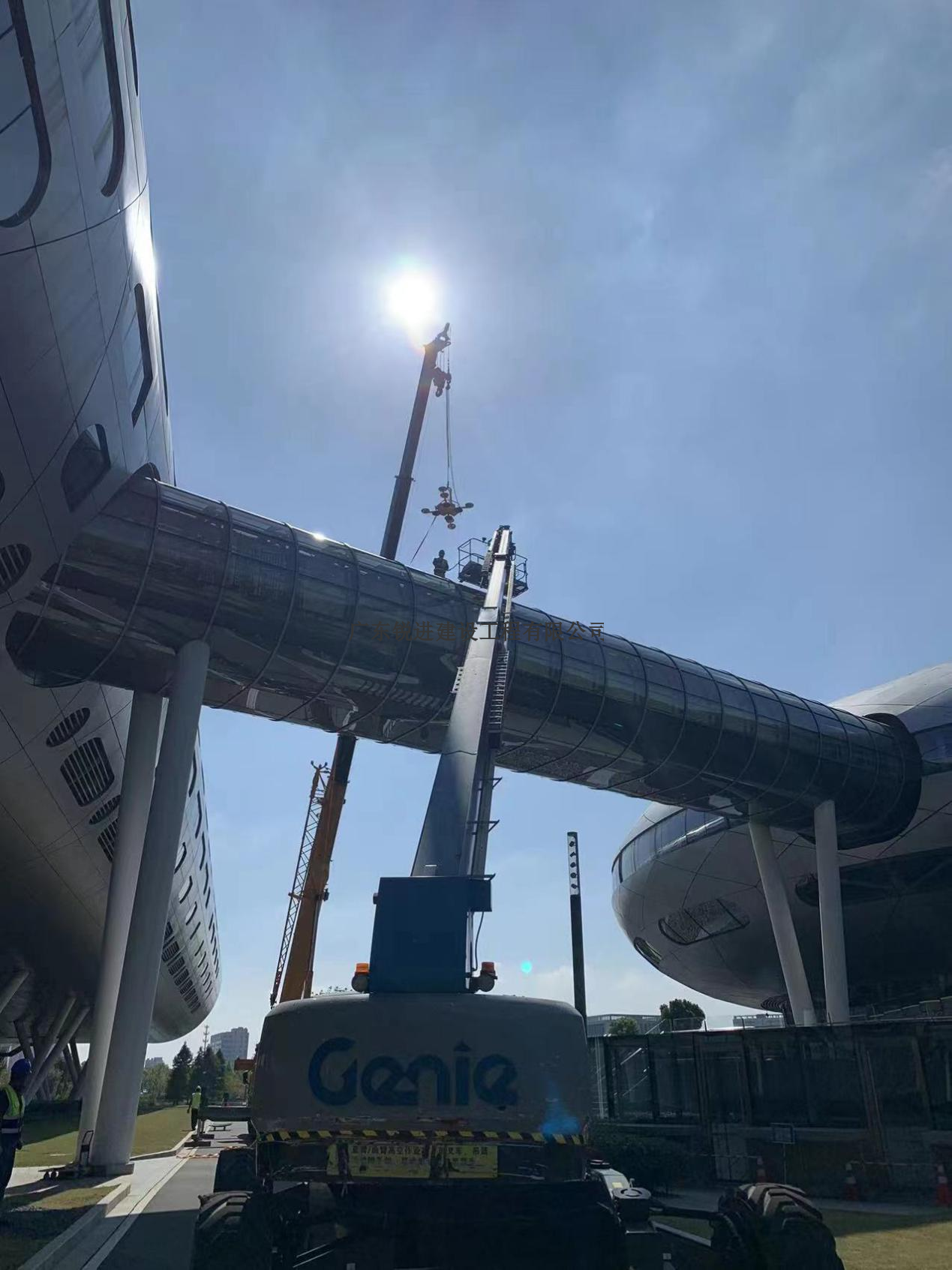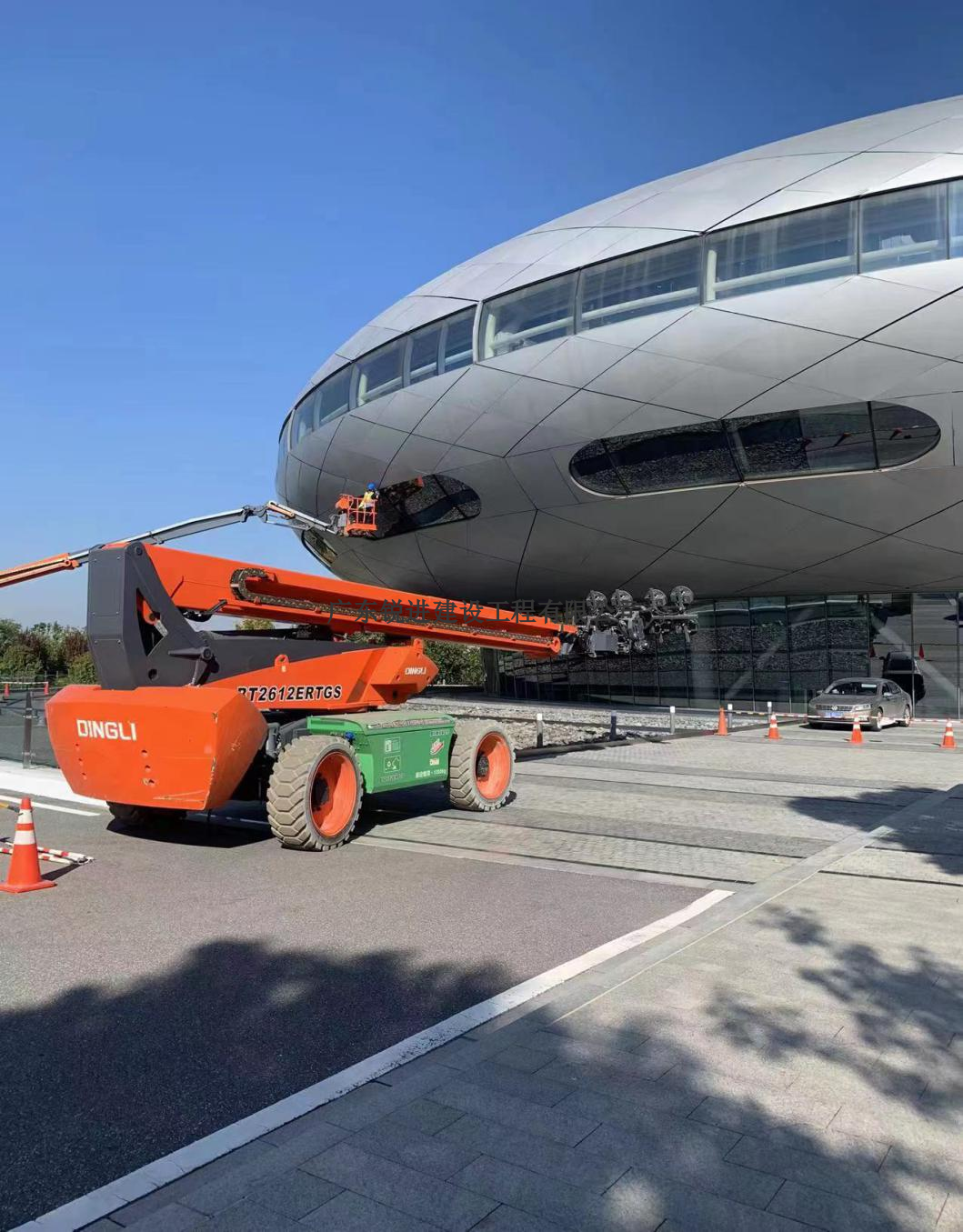 幕墻大面積采用雙曲結構,后期幕墻維修,玻璃更換,漏水維修需要采用專業(yè)設備,大型高空車和吸盤車。幕墻現場維修照片如下:
