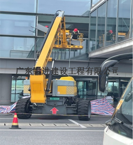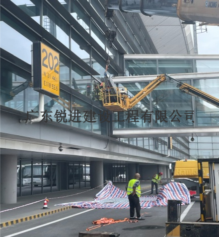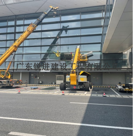 本工程大面積采用框架式玻璃幕墻,玻璃采用10(雙銀Low-E)+12Ar+8+1.9PVB+8mm中空鋼化夾膠玻璃,基本玻璃分格達(dá)到3.6x1.8m,單片重量約493公斤。這樣超大尺寸、超重的玻璃拆除、安裝十分困難;玻璃更換安裝過程,局部需要停飛,確保機(jī)場(chǎng)正常航班起降;施工安全防護(hù),成品保護(hù),施工工序要求很高。